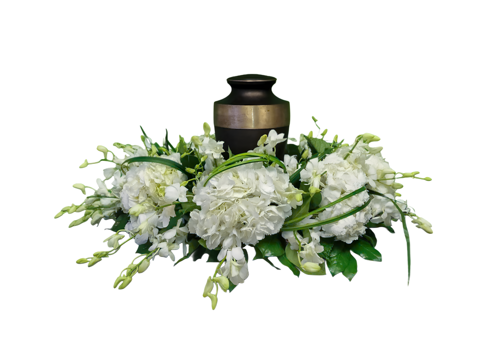 Arreglo para urna de hortensias y orquídeas.