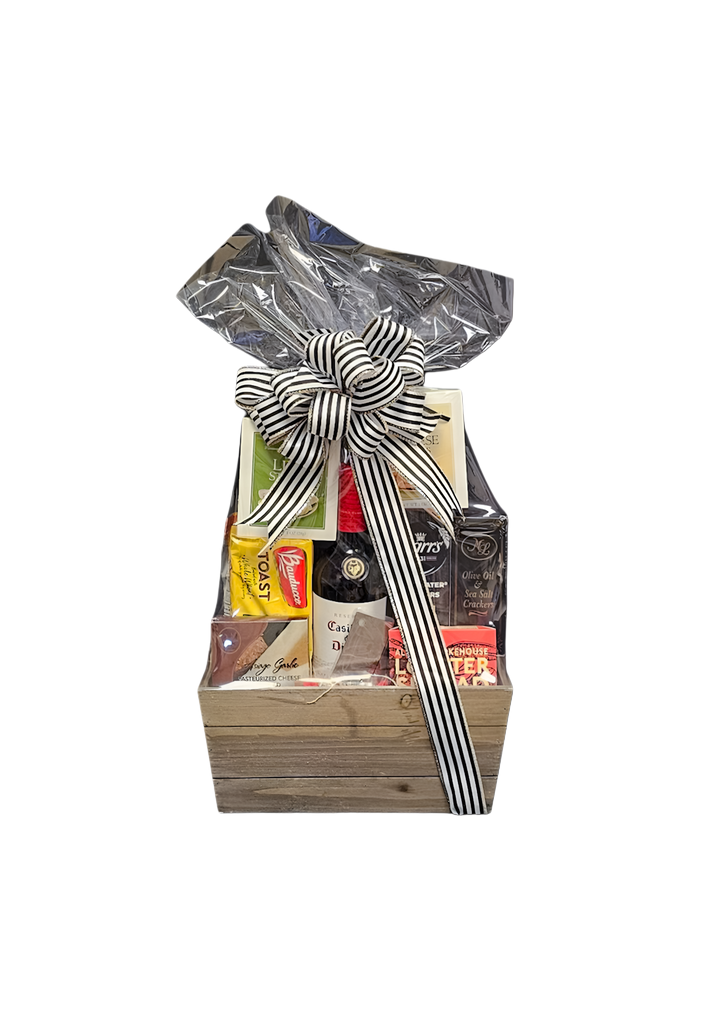 Canasta gourmet con botella de vino.