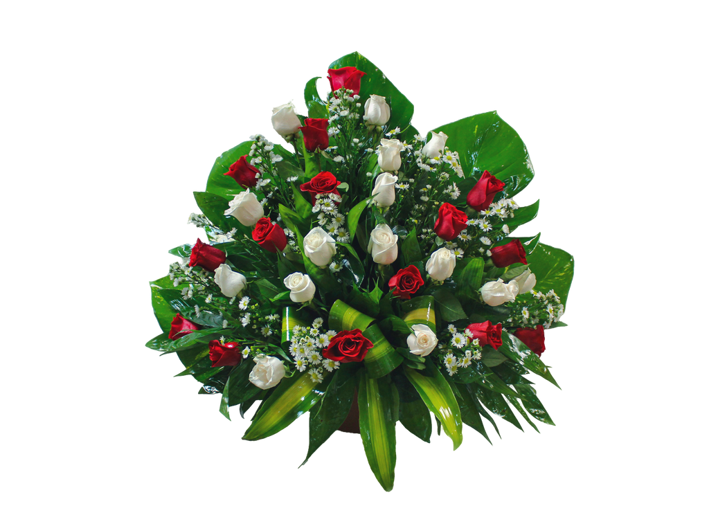 Canasta funeral de rosas blancas y rojas