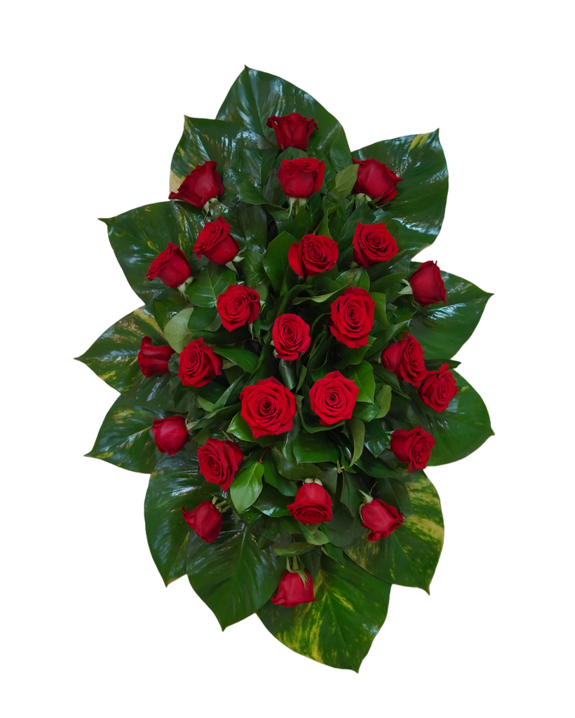Corona toda en rosas rojas. Incluye un mensaje impreso en una cinta.