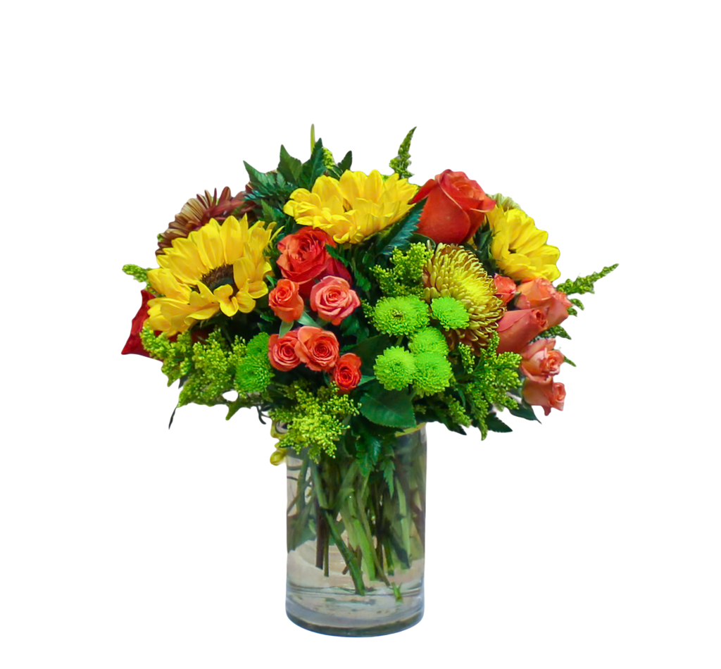 Arreglo de rosas, spray roses, girasoles, pinoccios, solidago y spiders